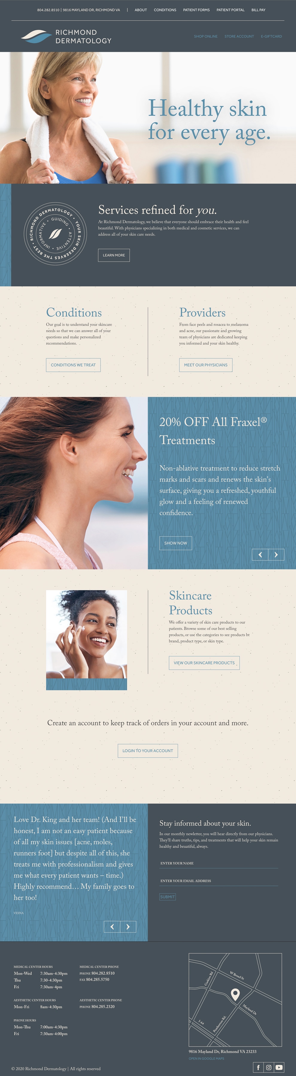 This website for Richmond Dermatology includes integration with an existing third-party e-commerce solution and a searchable database of conditions treated.